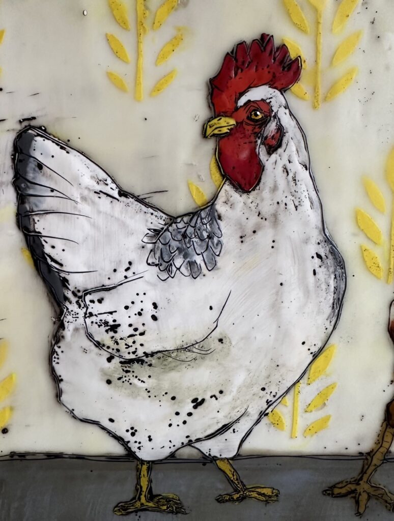 I use a sharp carving tool to create fine lines and details. I then fill in those carved lines with oil paint.
