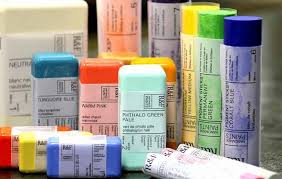The colors come in concentrated block form. I melt a little of the color with the clear medium to build my palette.